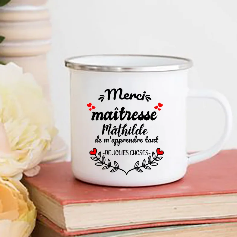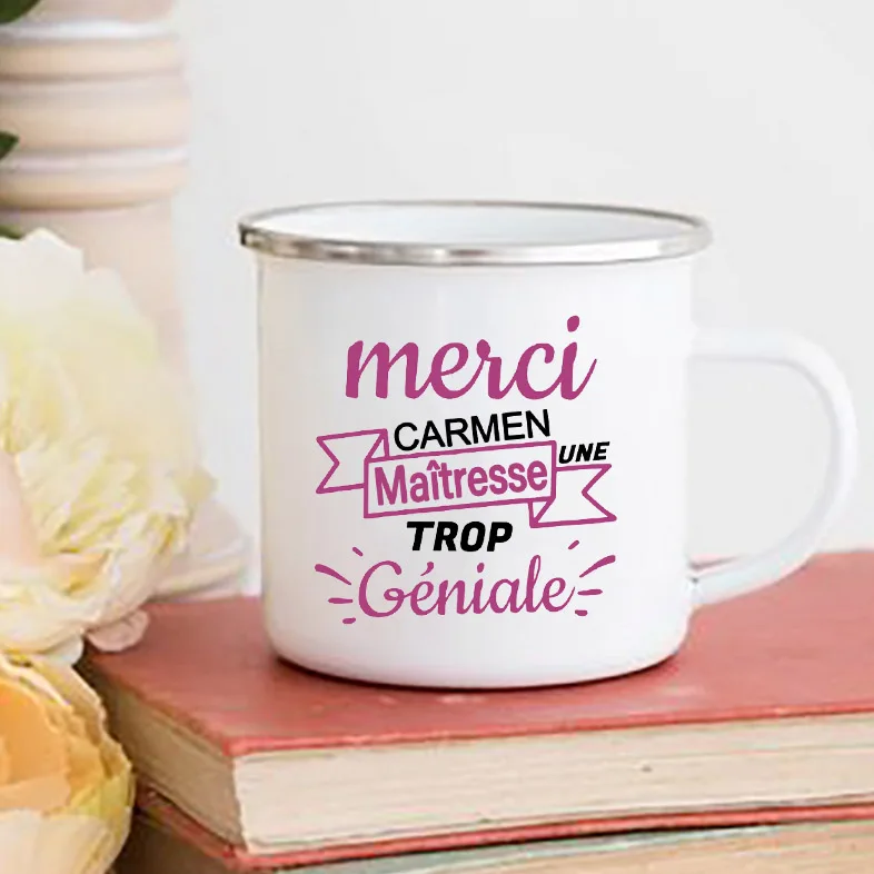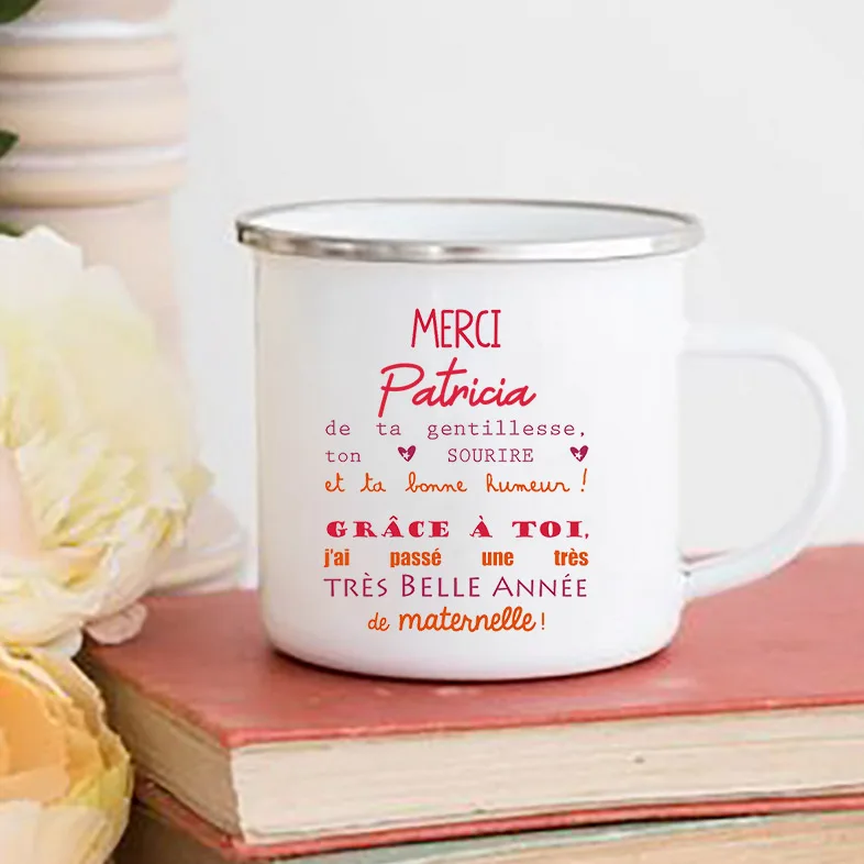 ------ Item Description ------ • Material: Enamel • Dimensions: height 3.14″ (8 cm), diameter 3.35″(8.5 cm) • White coating with a silver rim • Only print on ONE SIDE of the mug •Due to the rustic nature of mugs, you may see small imperfections such as dents, bubbles + other rustic features