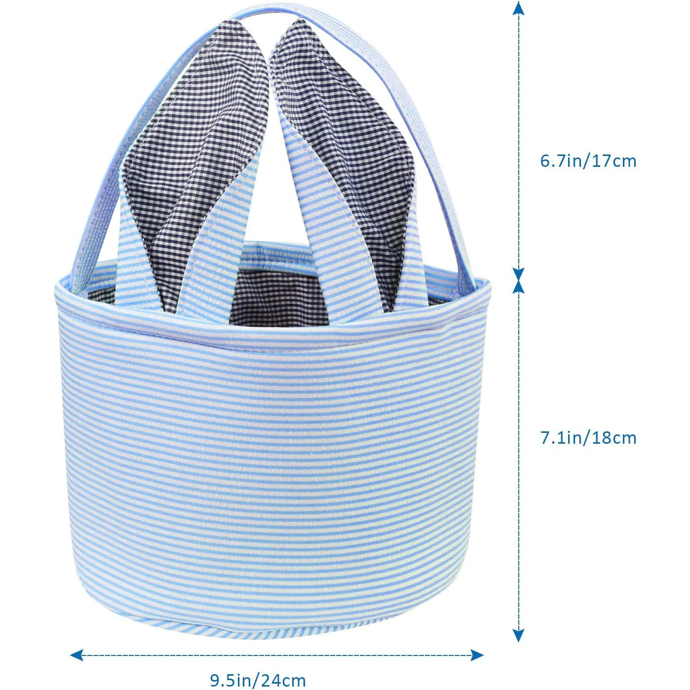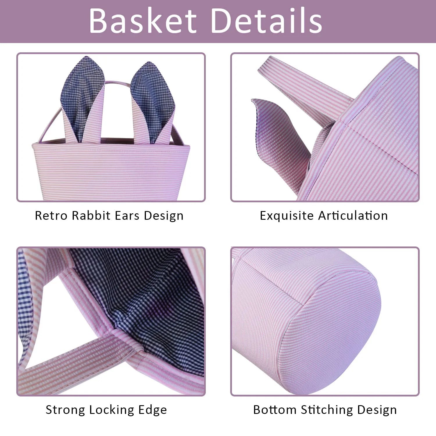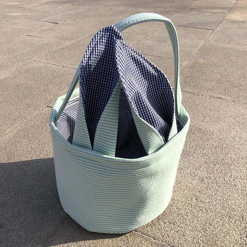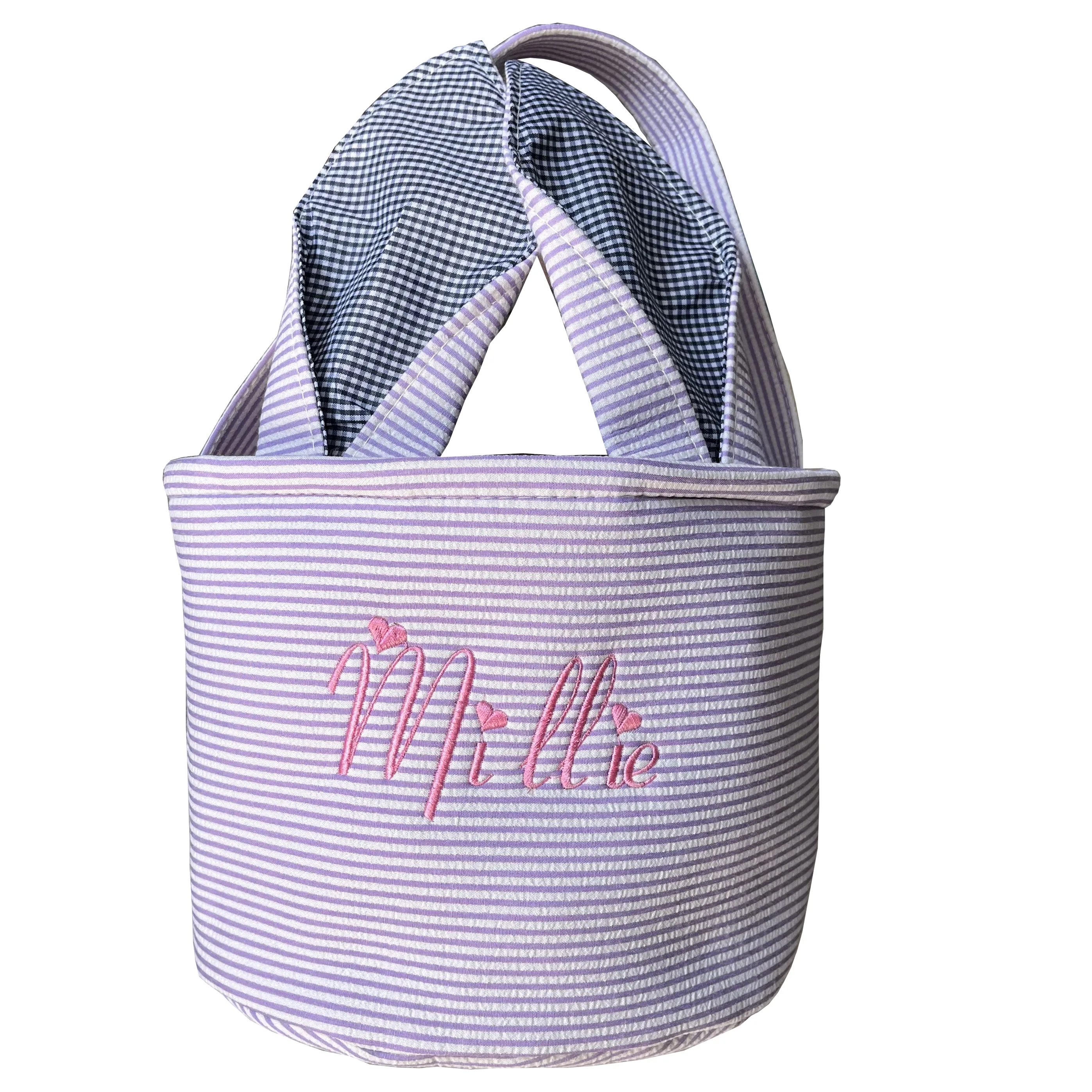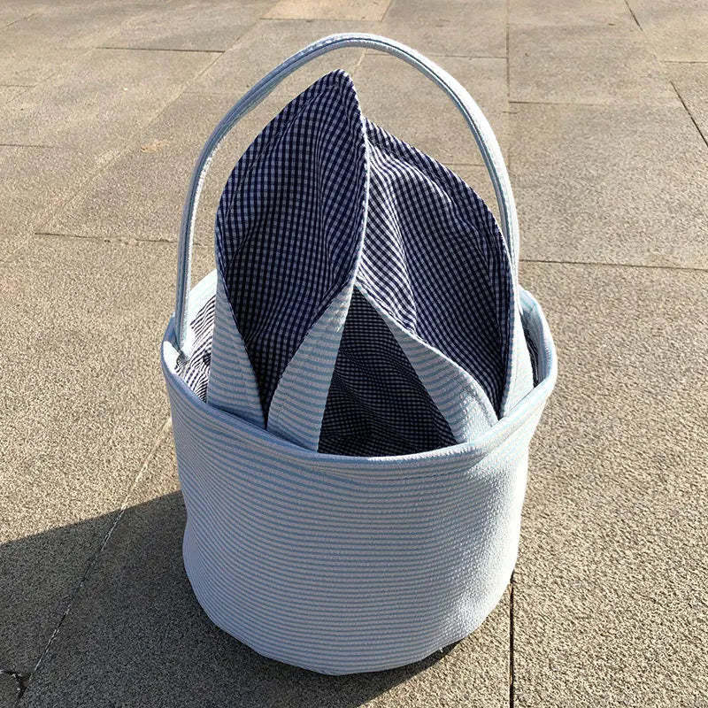Great Easter gifts for kids: This Easter basket perfectly combines stripes and grid elements. Two foldable rabbit ear handles make the shapes more diverse. There are many colors to choose from in Easter baskets, blue, pink, purple and green, it will become the perfect choice for Easter.