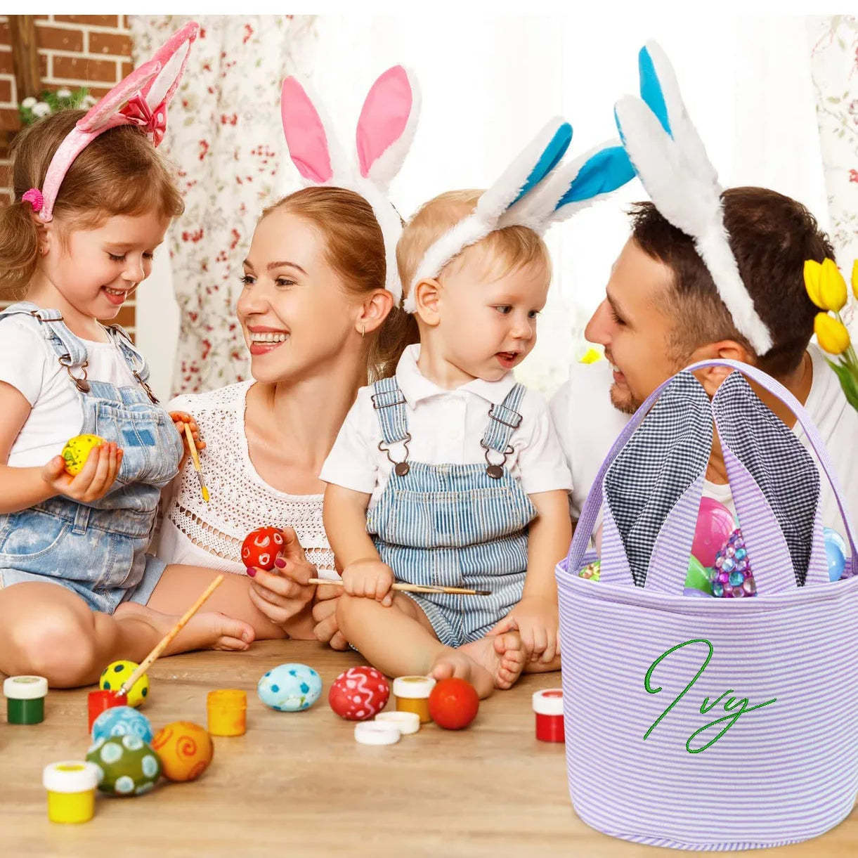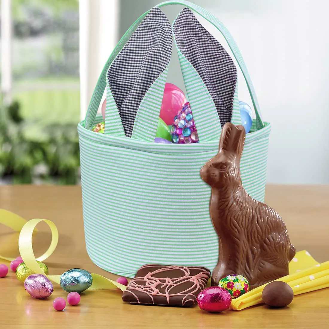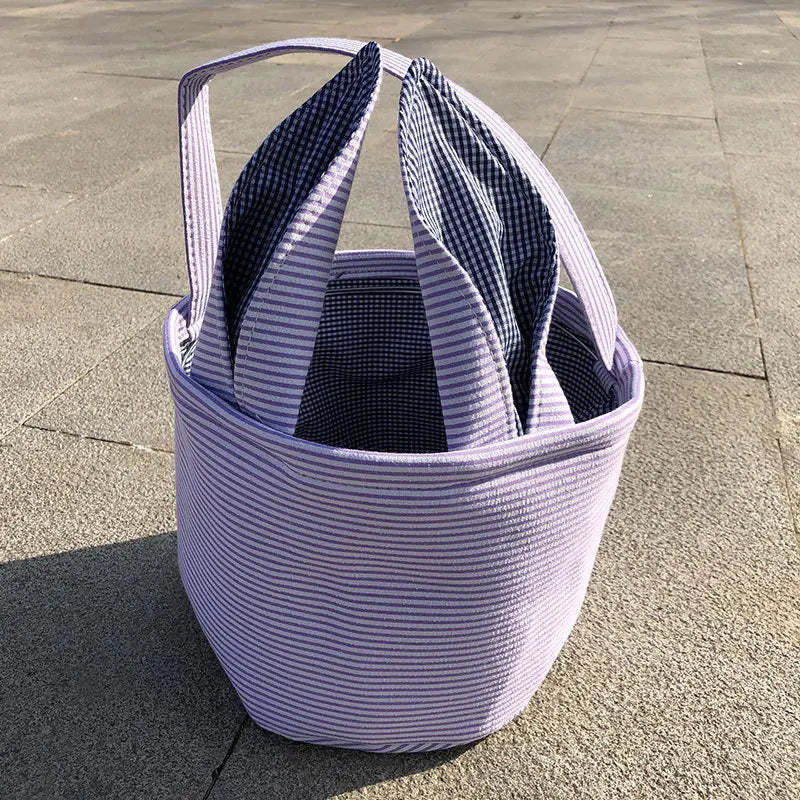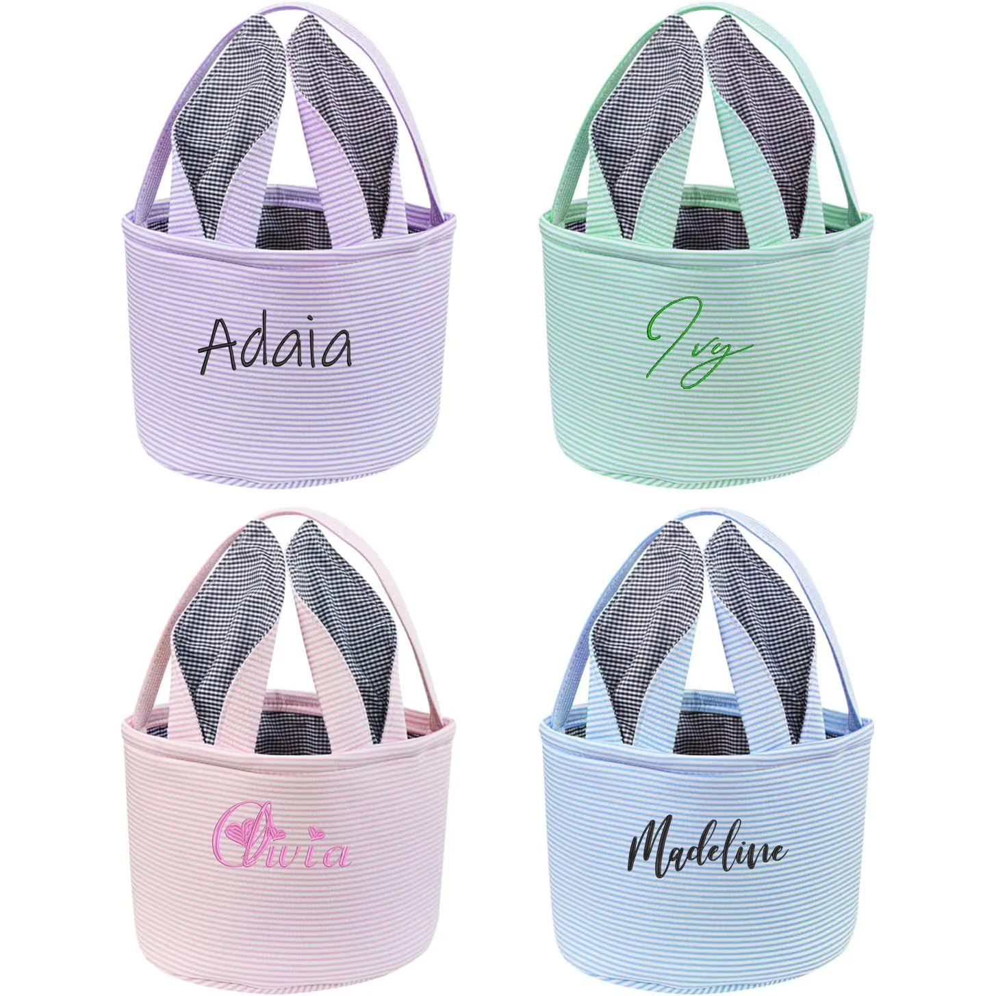 Great Easter gifts for kids: This Easter basket perfectly combines stripes and grid elements. Two foldable rabbit ear handles make the shapes more diverse. There are many colors to choose from in Easter baskets, blue, pink, purple and green, it will become the perfect choice for Easter.