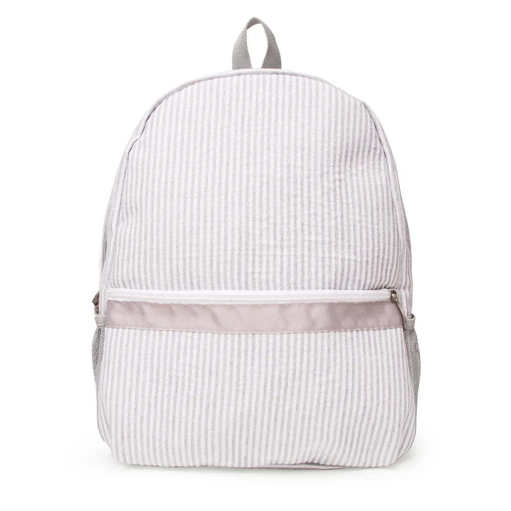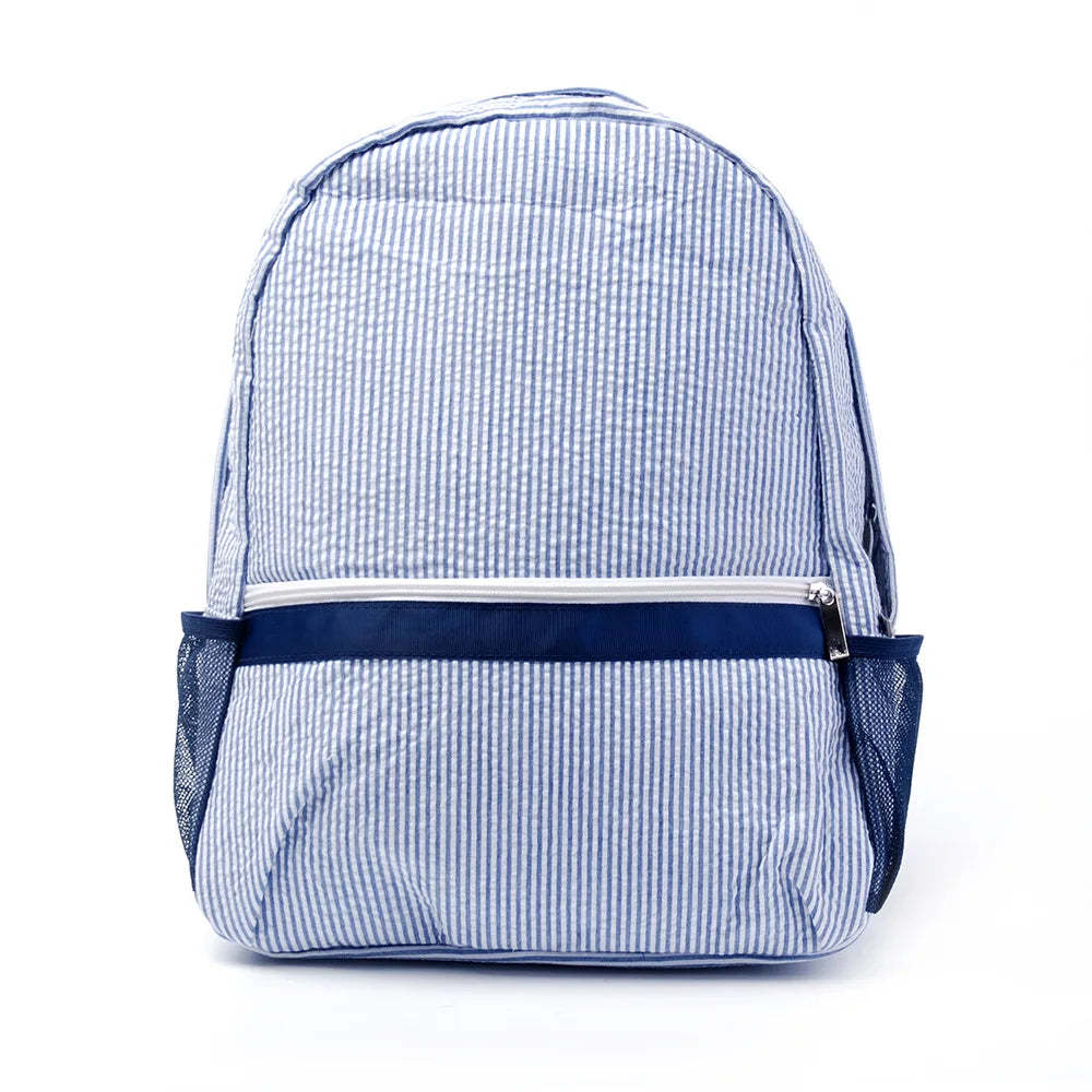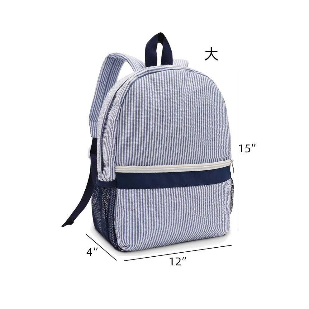 1. Its full size Seersucker ackpack perfect for 8-12Y. Zipper closure and adjustable shoulder straps.