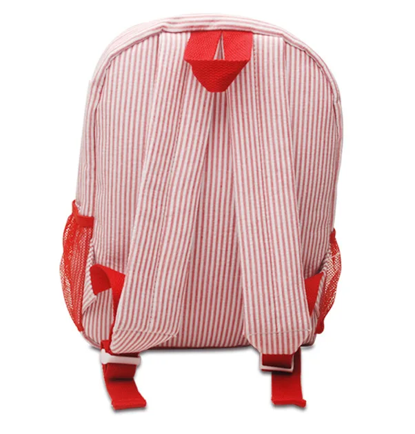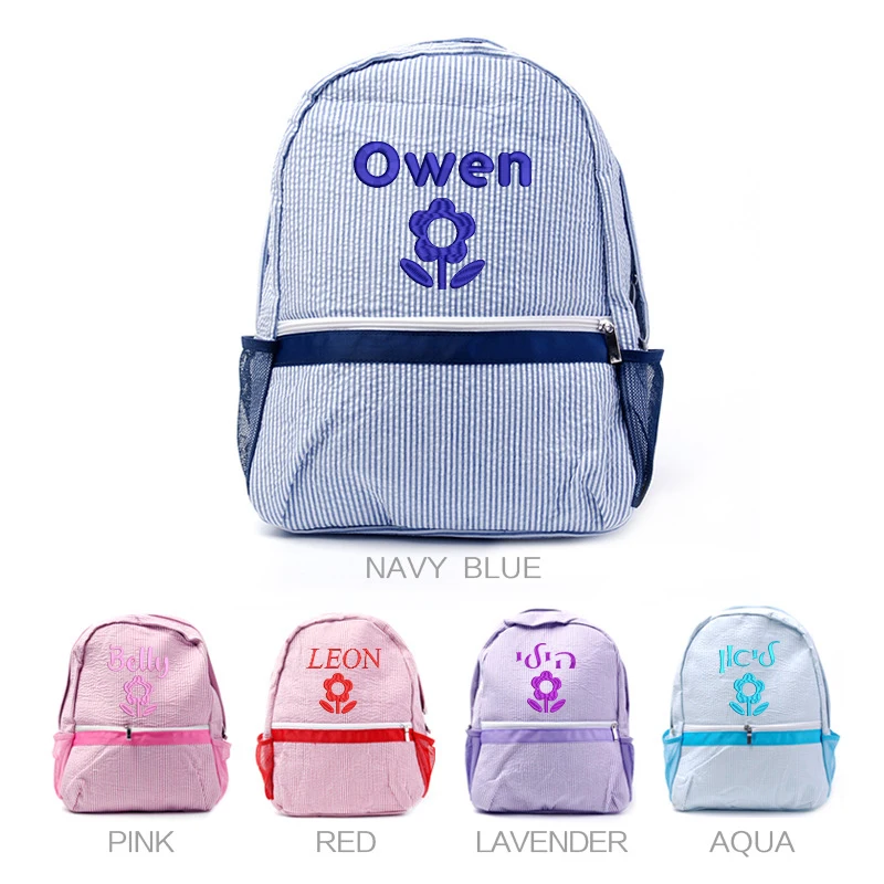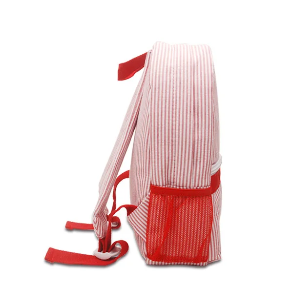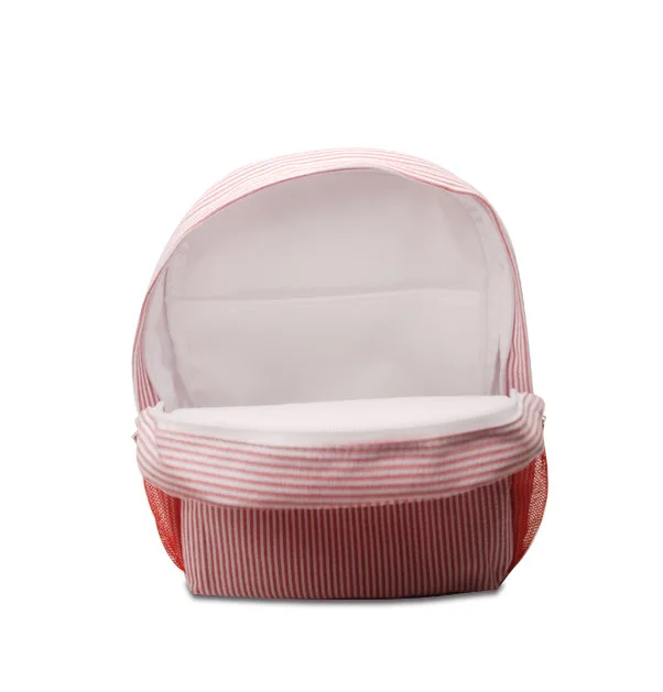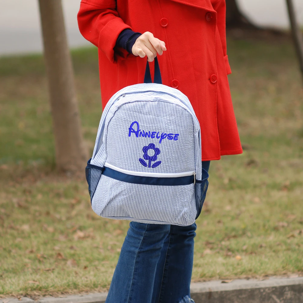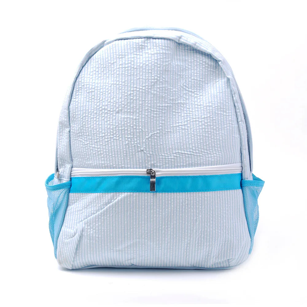 1. Its full size Seersucker ackpack perfect for 8-12Y. Zipper closure and adjustable shoulder straps.