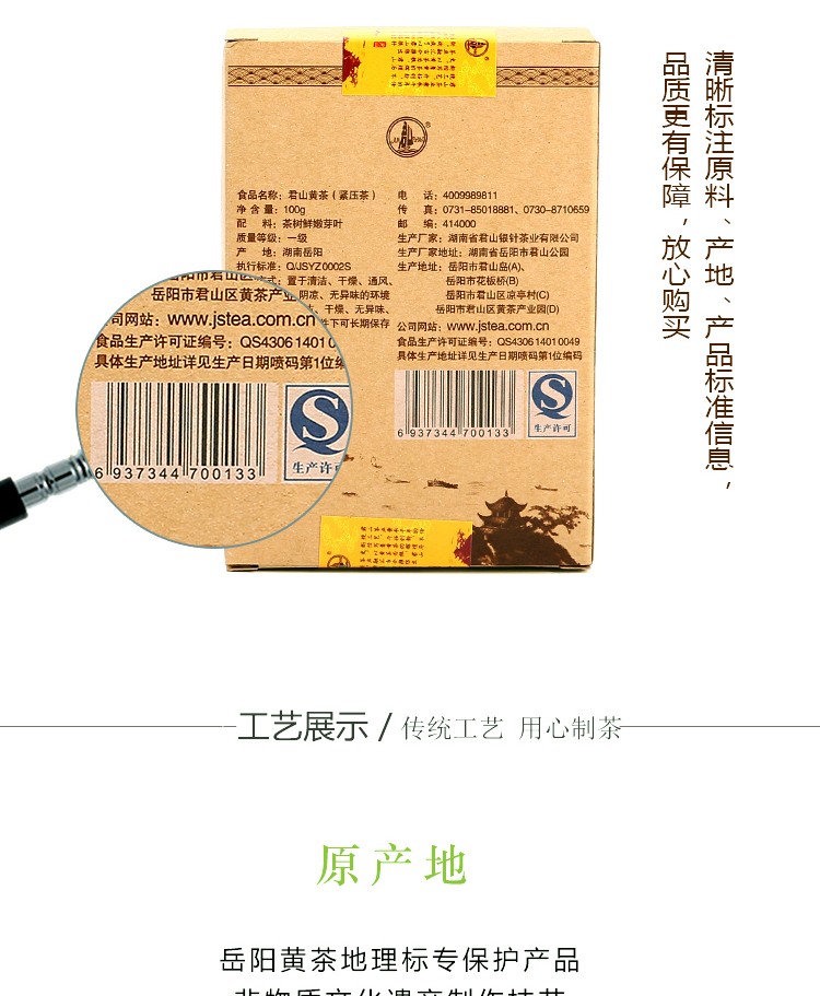 Type:Yellow Tea Net Weight:100g Packaging: Box Origin: Yueyang,Hunan,China