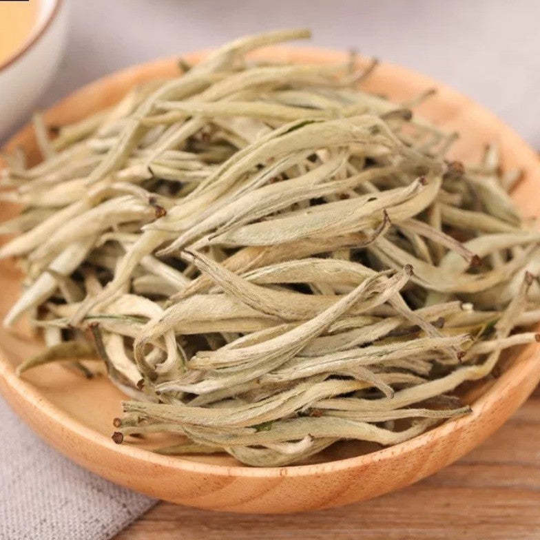 Baihao Yinzhen, also known as silver needle, a highly sought after white tea made in Yunnan province and only harvested for a couple of days each Spring, boasts young tender buds freshly plucked right before opening. Silver Needle is characterized by its unique needle like appearance covered with small white hair on the bud. Baihao Yinzhen White tea is also classed in the top ten when it comes to superior. A genuine Silver Needle is a white tea. As such, it is only lightly oxidized. The best productions are from the first flushes, which generally take place between late March to early April, when the year's first new buds "flush". For the production of Silver Needle, only the leaf shoots, i.e. the leaf buds before opening, are plucked.