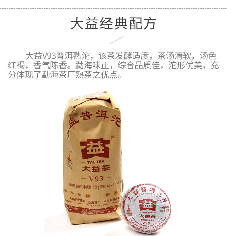 V93 ripe Pu Er tea was first released in 2005, a high classic, quality ripe Pu Er tea. Why it is called V93? Because it inherits the special recipe of high quality Menghai Pu Er tea produced in 1993; V is the code summary for the V93, V2, V4 series of Pu Er tea, whose recipes are the combination of past classic Maocha techniques, quality characters, taste and aroma with the new processing and invention.