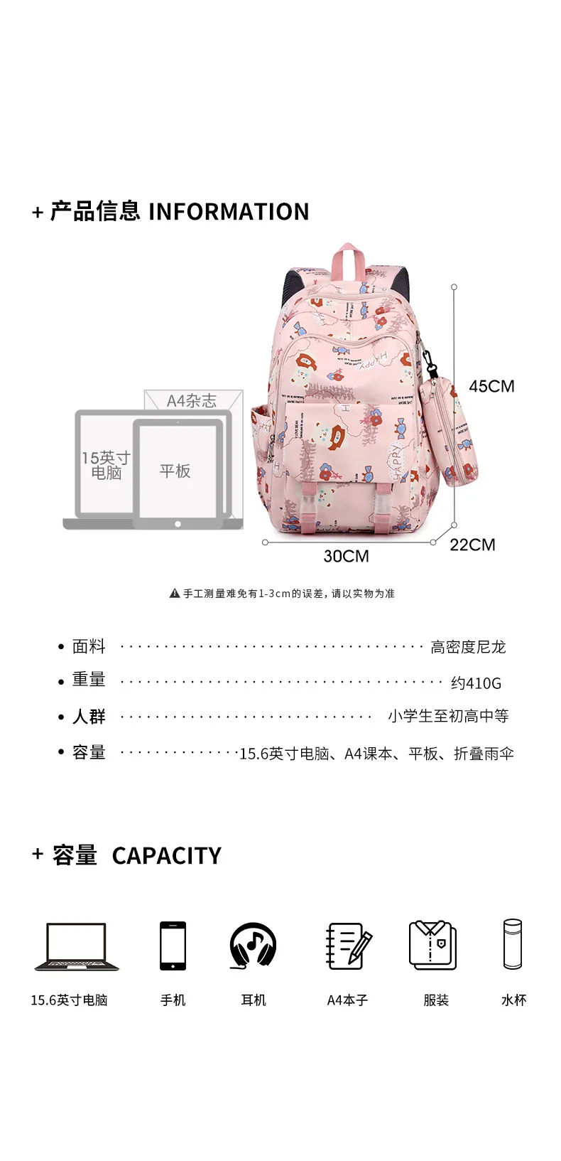 Capacity: 15.6-inch computer, A4 textbook, tablet, folding umbrella