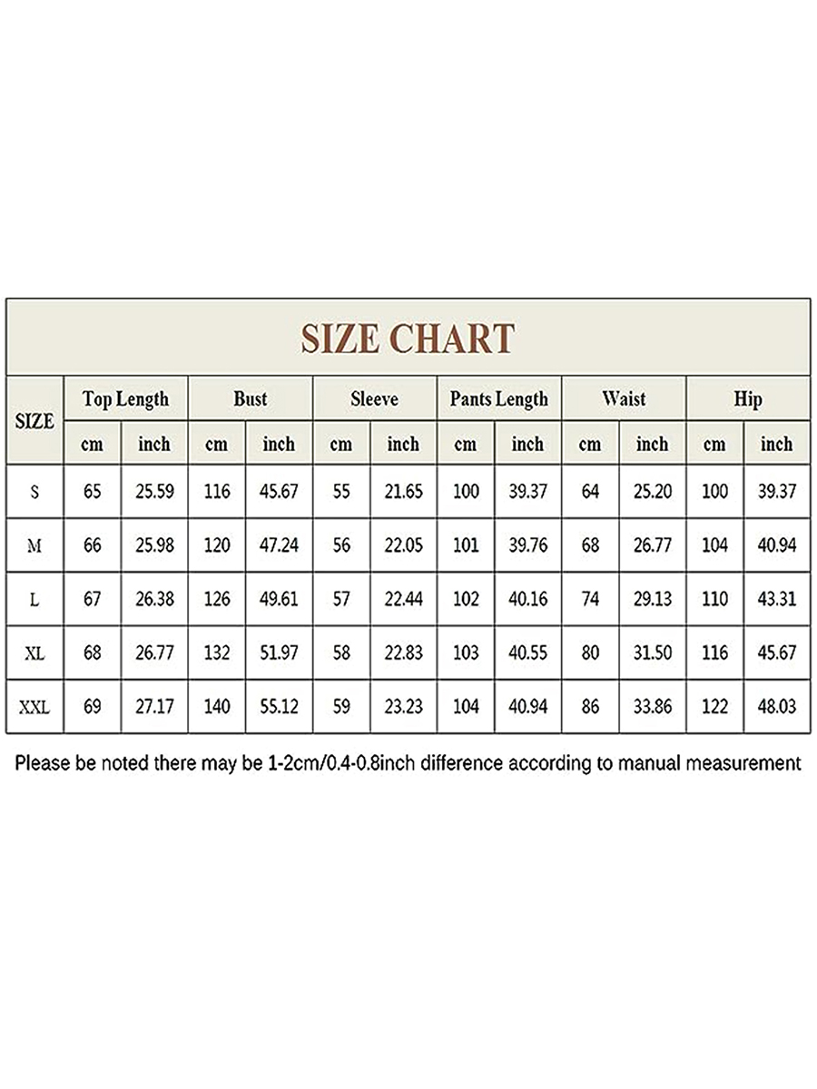 XXL Tops Length: 27.17 Bust: 55.12 Pant Length: 40.94 Waist: 33.86 Sleeve: 23.23 Hip: 48.03