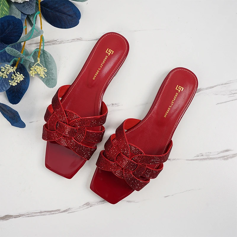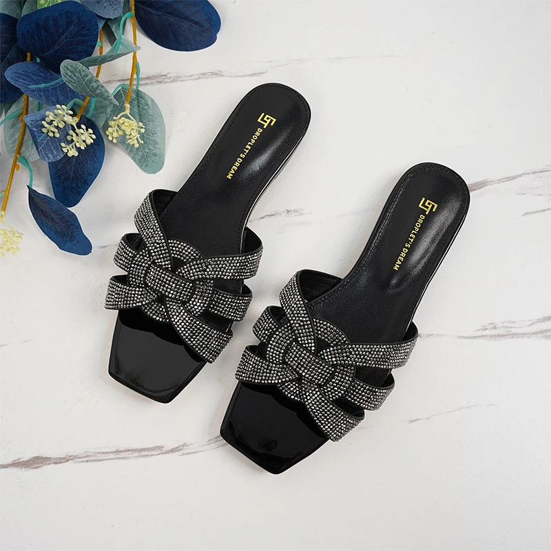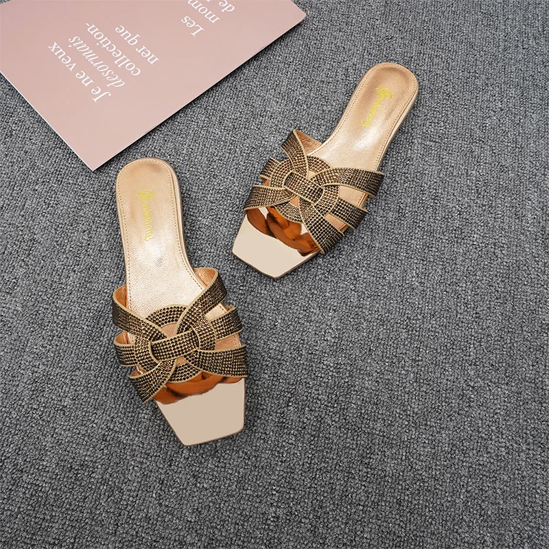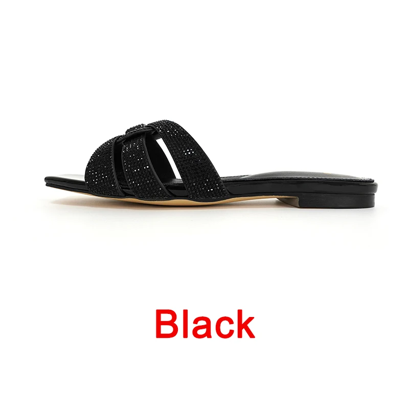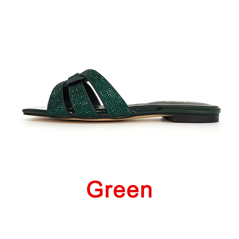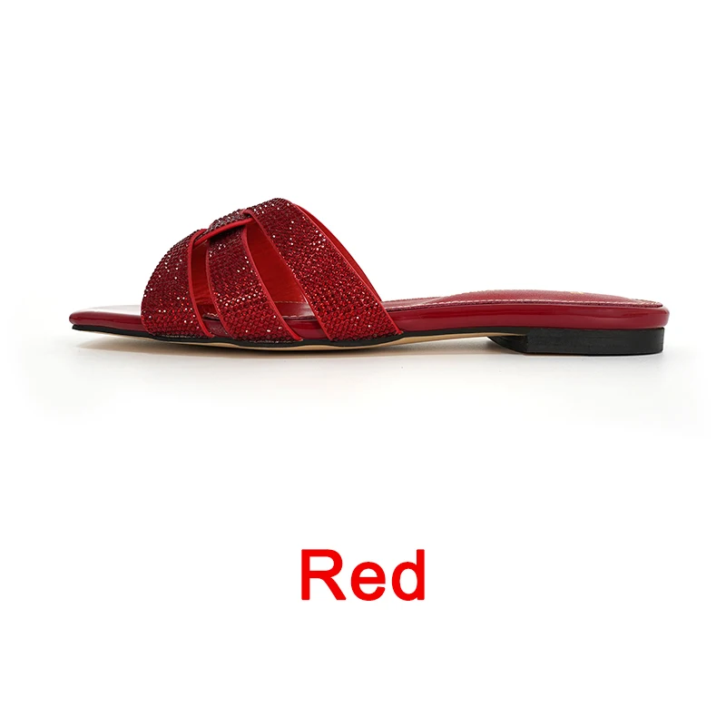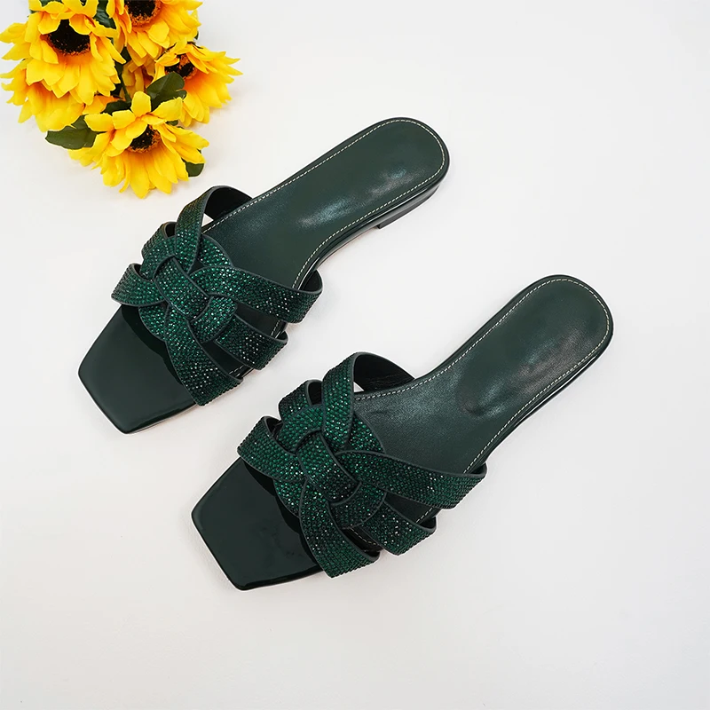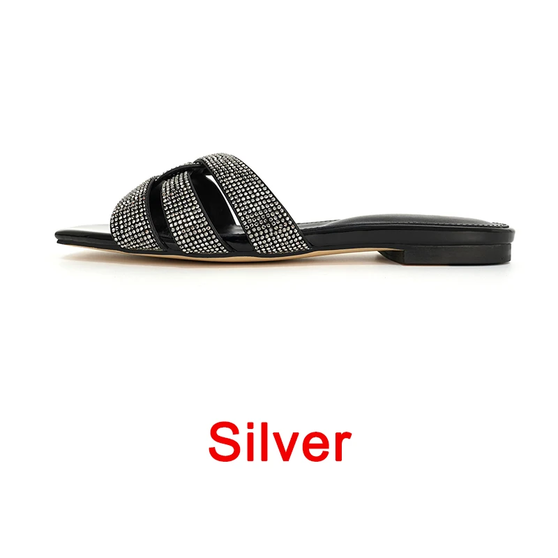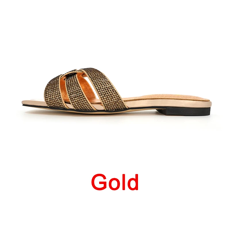 Summer Trendy Fashion Luxury Party Flat Heel Fish Mouth Diamond Party Women Shoes Real Leather plus size Women Slippers 34-44