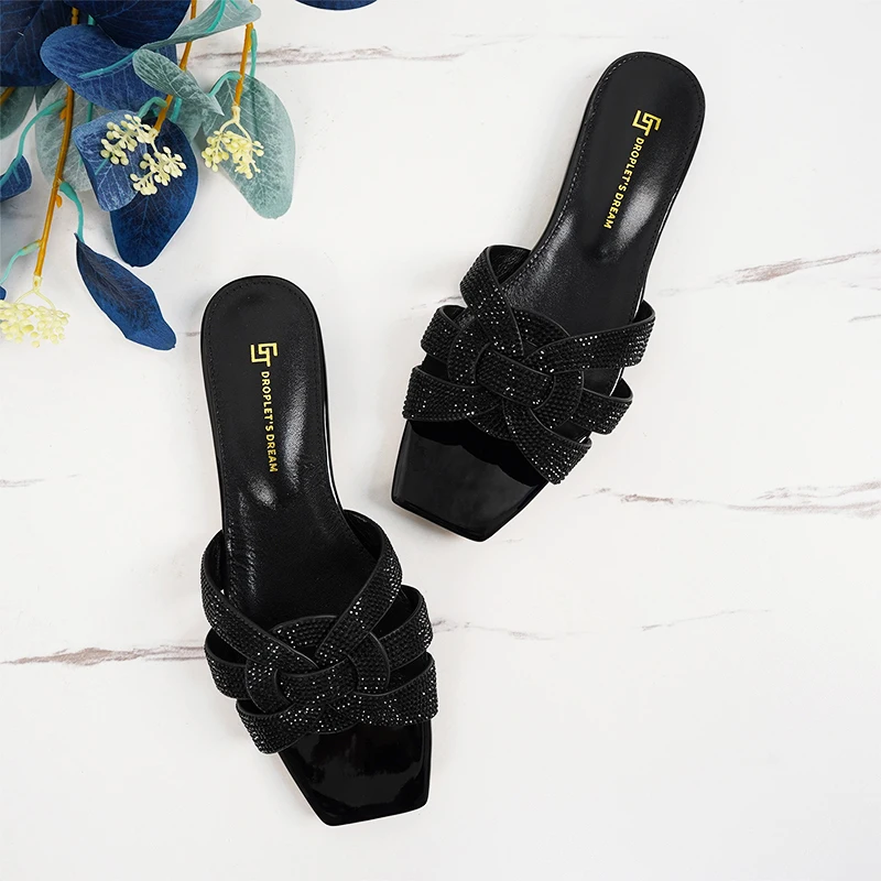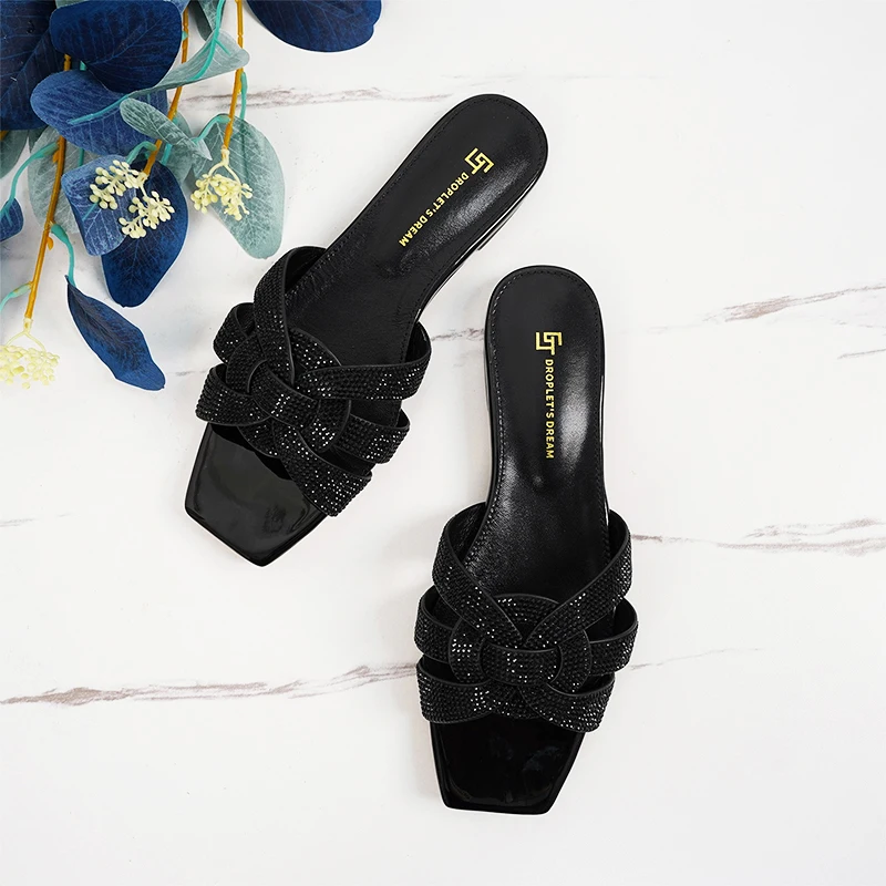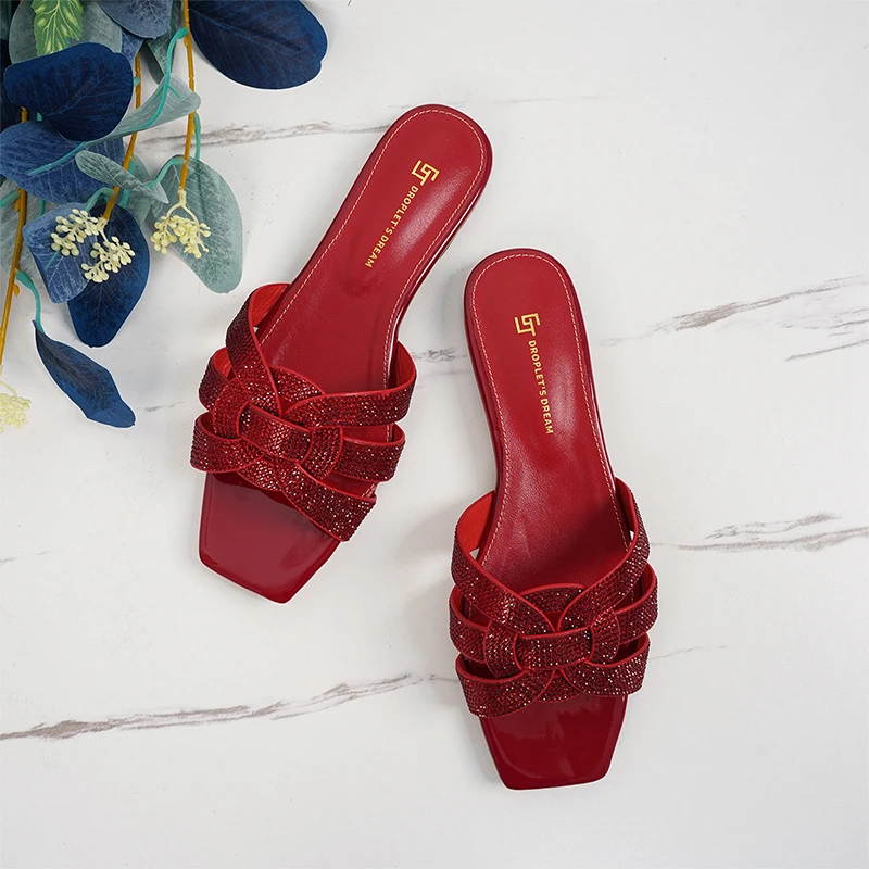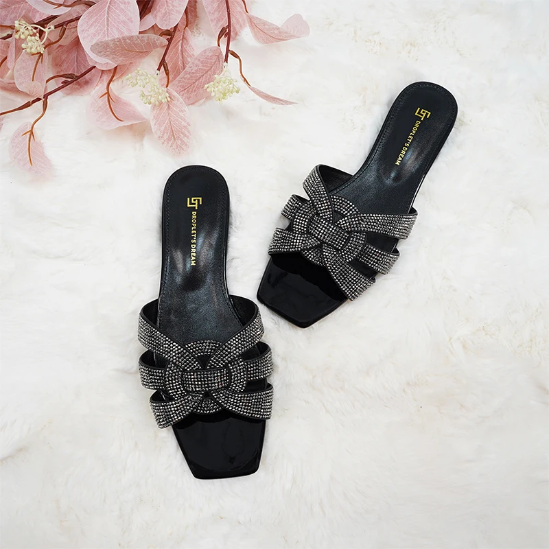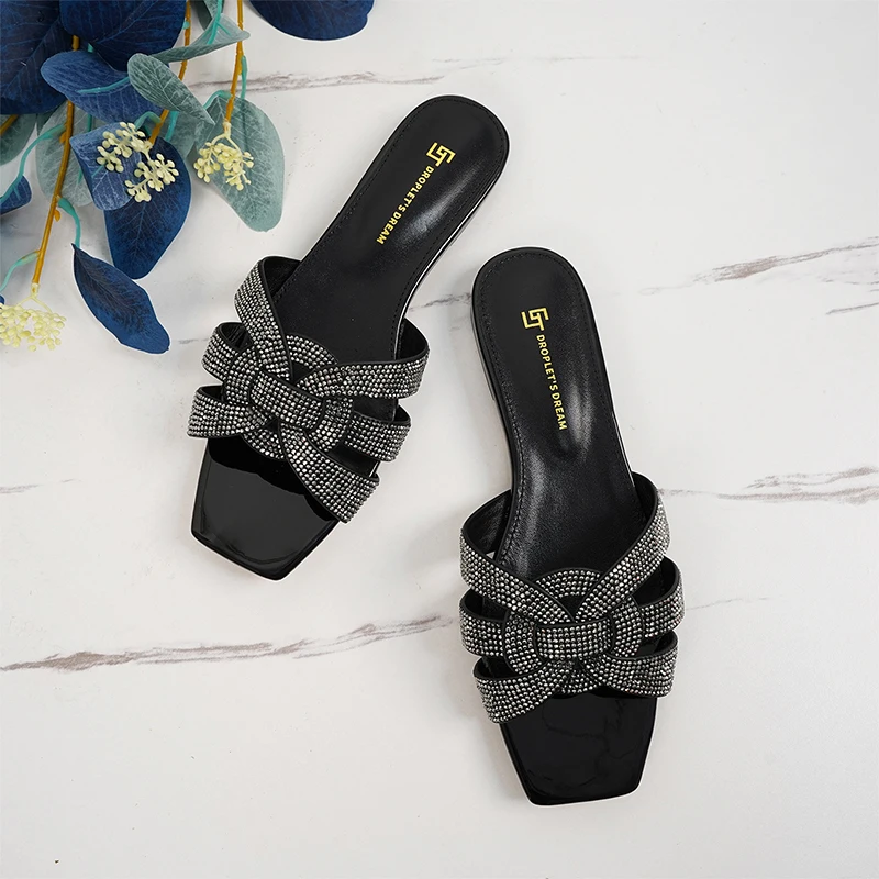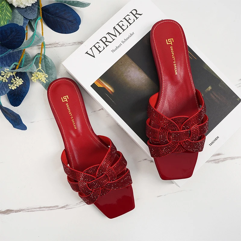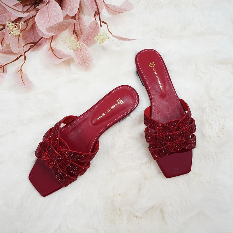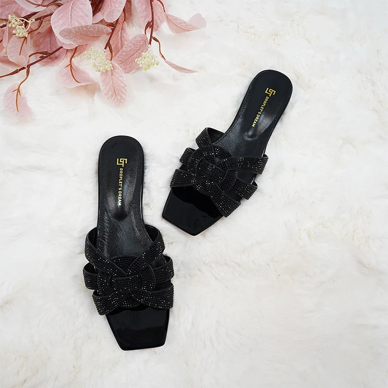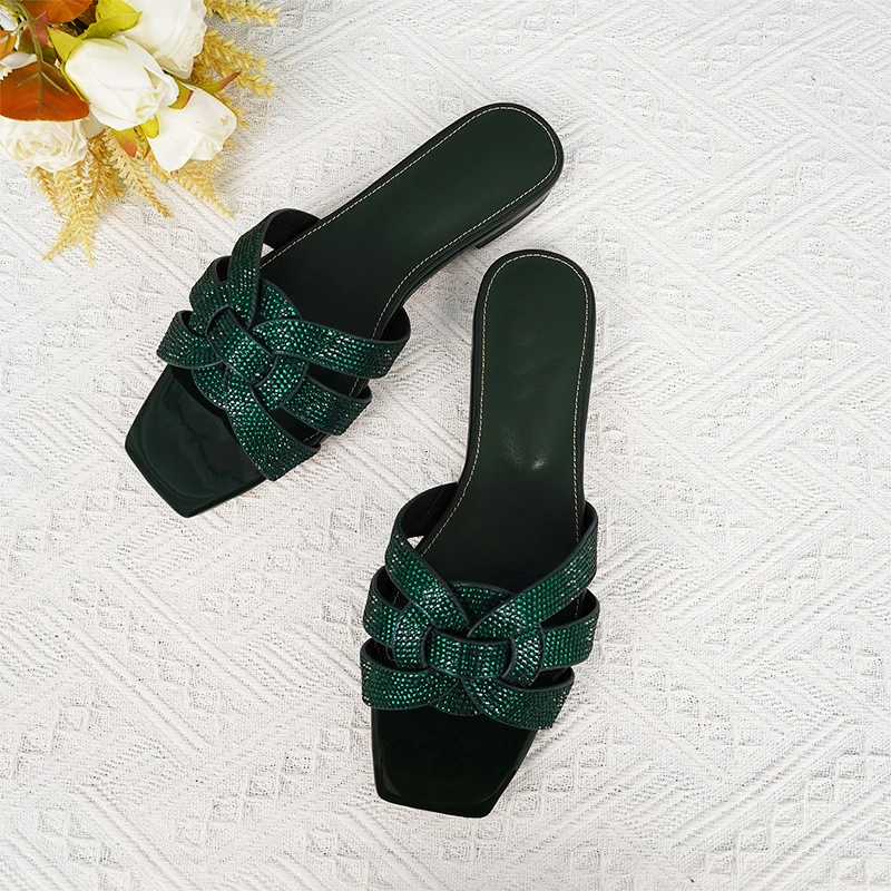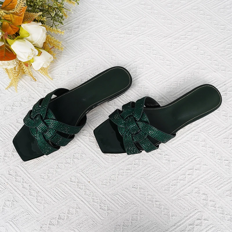 Summer Trendy Fashion Luxury Party Flat Heel Fish Mouth Diamond Party Women Shoes Real Leather plus size Women Slippers 34-44