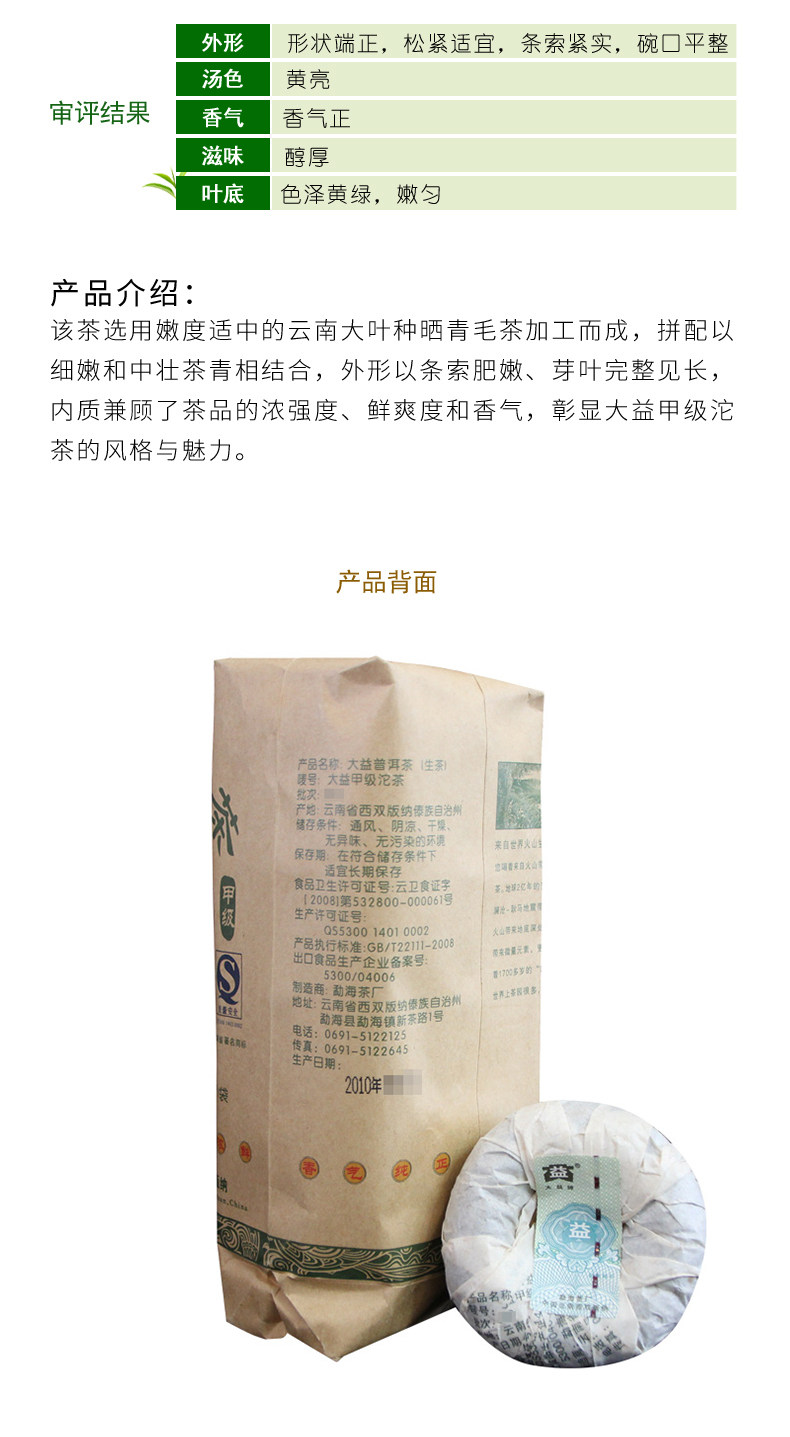 Tea Type: Raw Puer Tuo cha Net weight: 100g/pc, Price for one bag, 5pcs/bag. Total : 500g. Production Date: 2010 Year. Origin: Menghai,Yunnan,China Manufacturer: Menghai Tea factory,TAETEA Group.