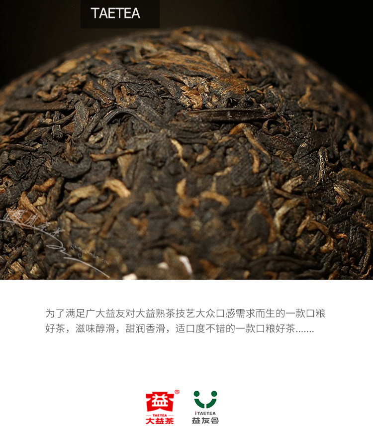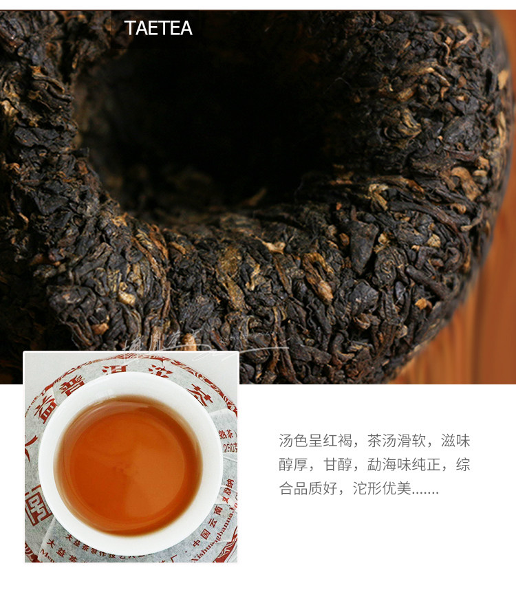 This tea's fermentation is appriate, which is super for futher aging and storage. Its tea liquid is smooth and soft, with mellow and thick taste. Its sweet after taste is very long due to its careful selection on the Maocha. This is a ripe tea full of good Menghai taste. Good to long term storage and taste.