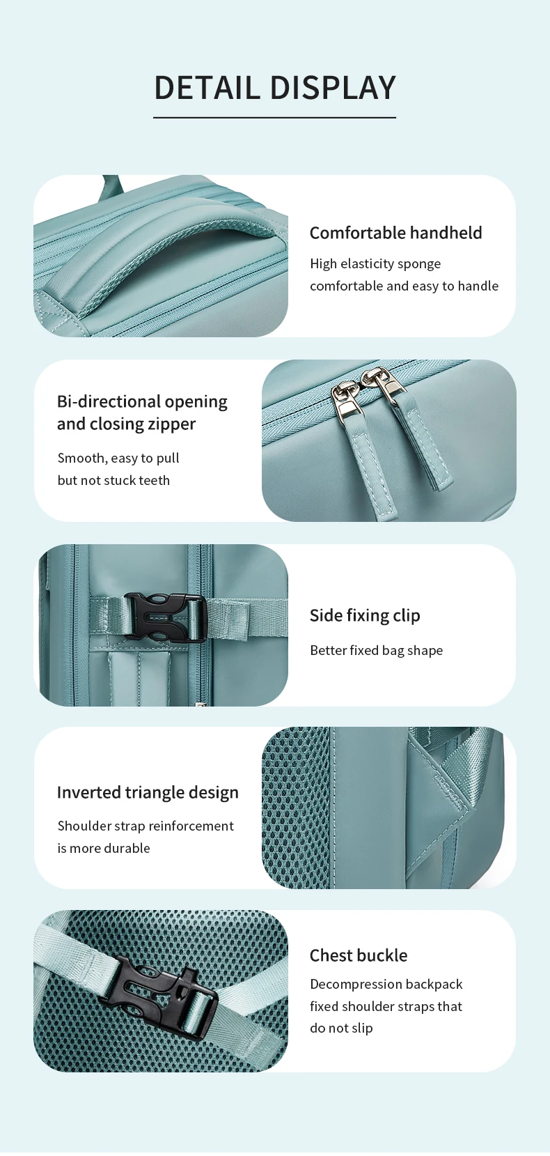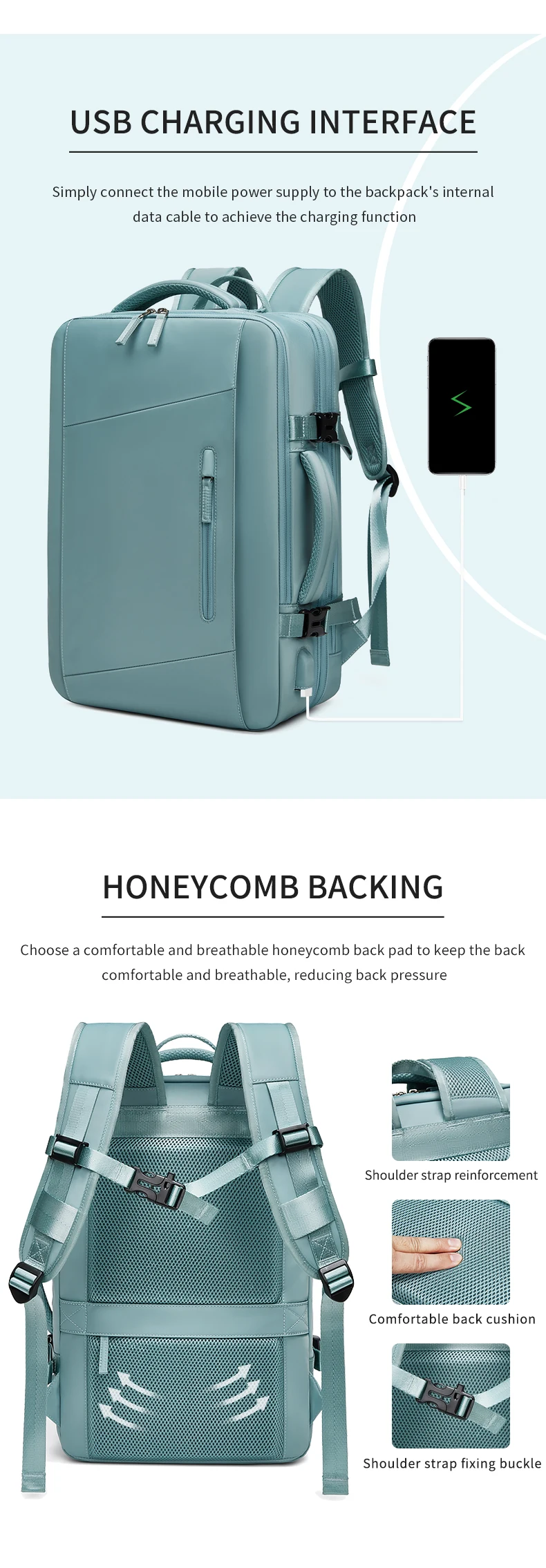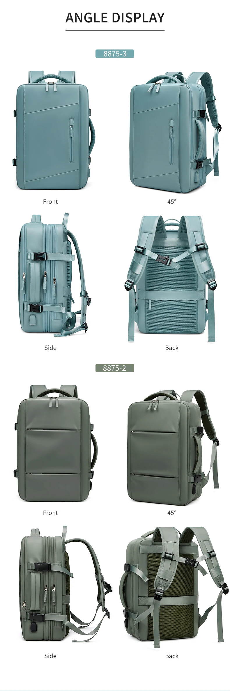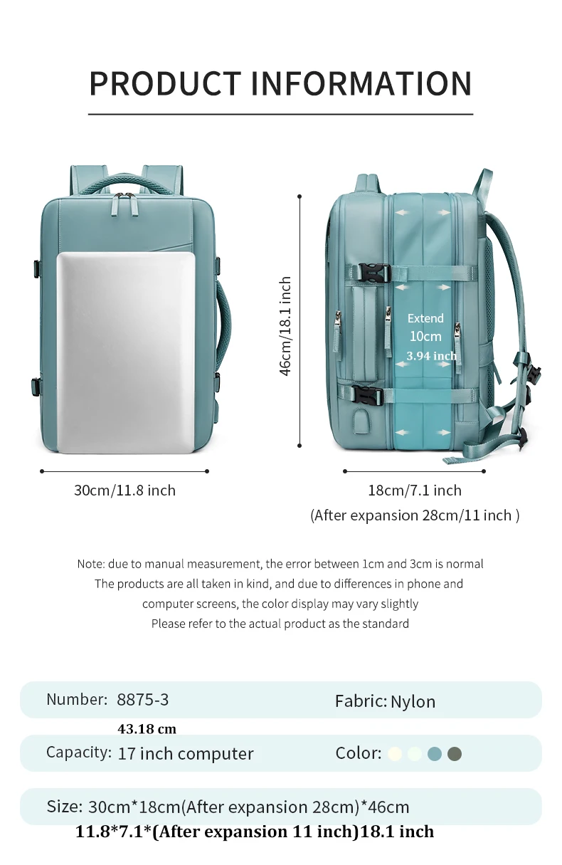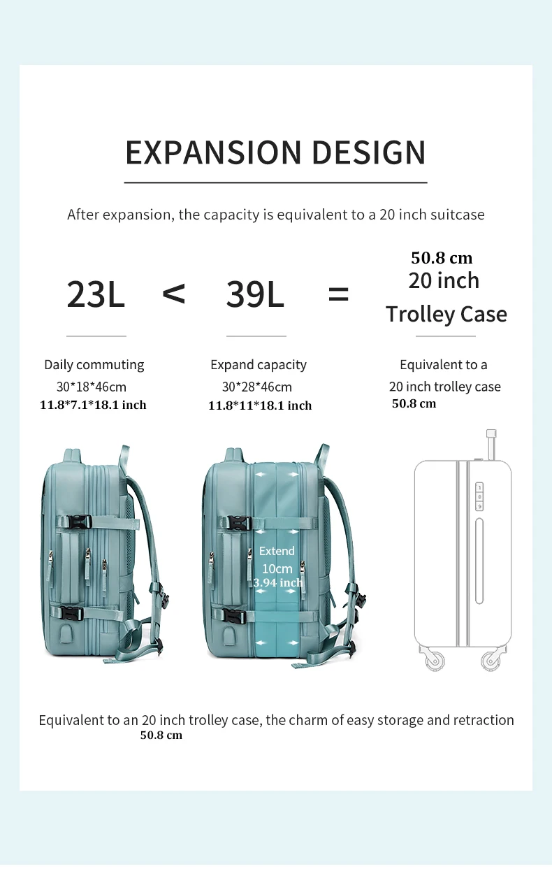 Function: 1. Expansion design 2. High capacity design (39L) 3. Wet and dry separation bag 4. Can accommodate a 17 inch laptop 5. USB charging interface 6. Waterproof material 7. Breathable sponge back cushion 8. Multi compartment design 9. Independent laptop bag 10. Can be inserted into the luggage compartment 11. Back anti-theft bag 12. Shoulder strap glasses buckle