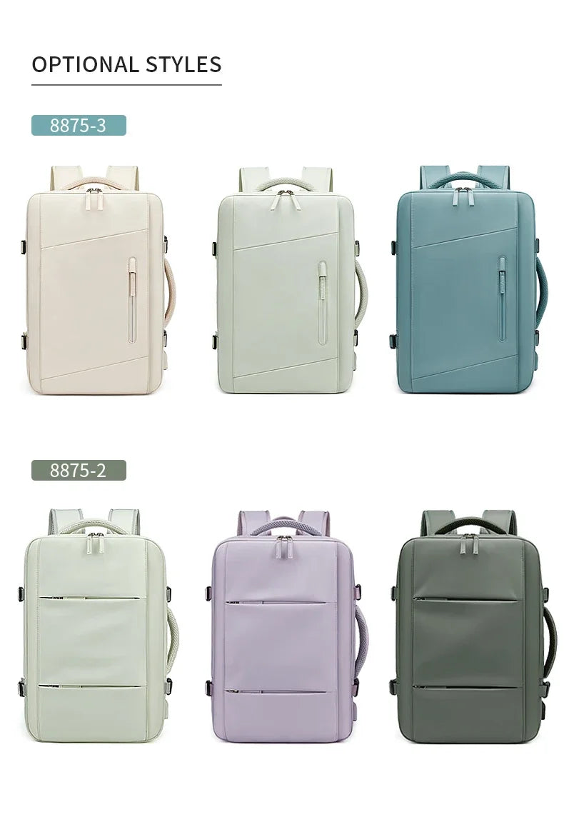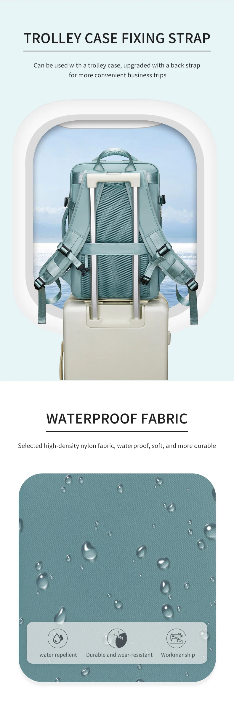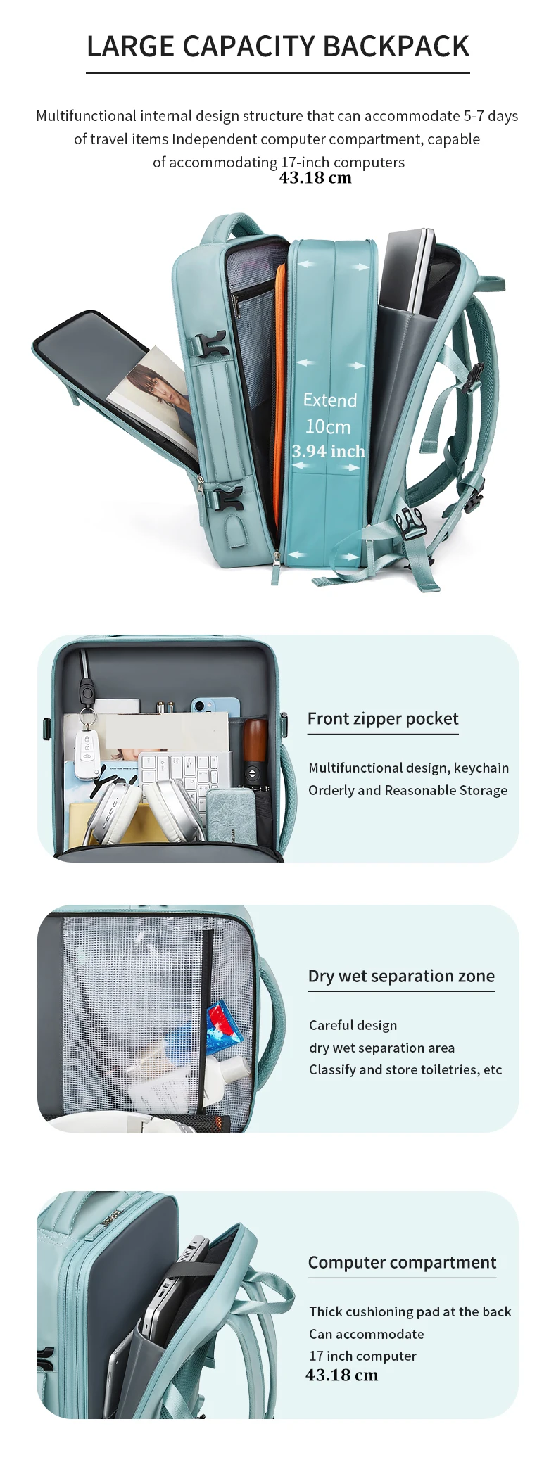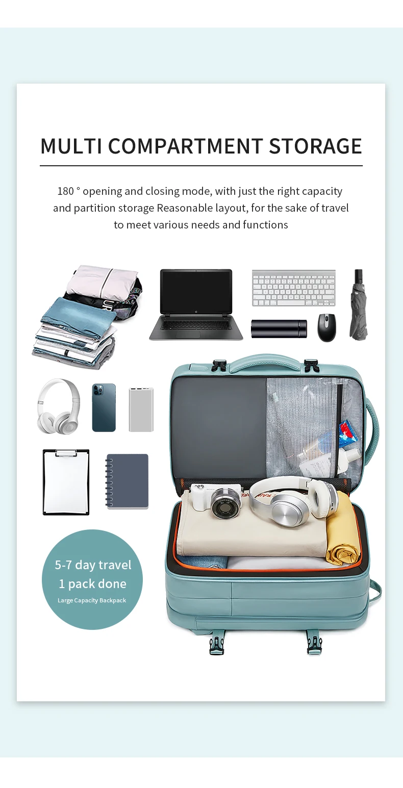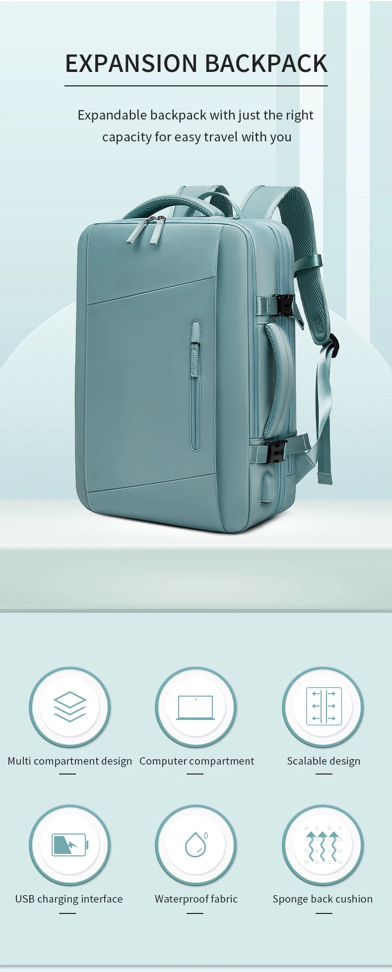 Function: 1. Expansion design 2. High capacity design (39L) 3. Wet and dry separation bag 4. Can accommodate a 17 inch laptop 5. USB charging interface 6. Waterproof material 7. Breathable sponge back cushion 8. Multi compartment design 9. Independent laptop bag 10. Can be inserted into the luggage compartment 11. Back anti-theft bag 12. Shoulder strap glasses buckle