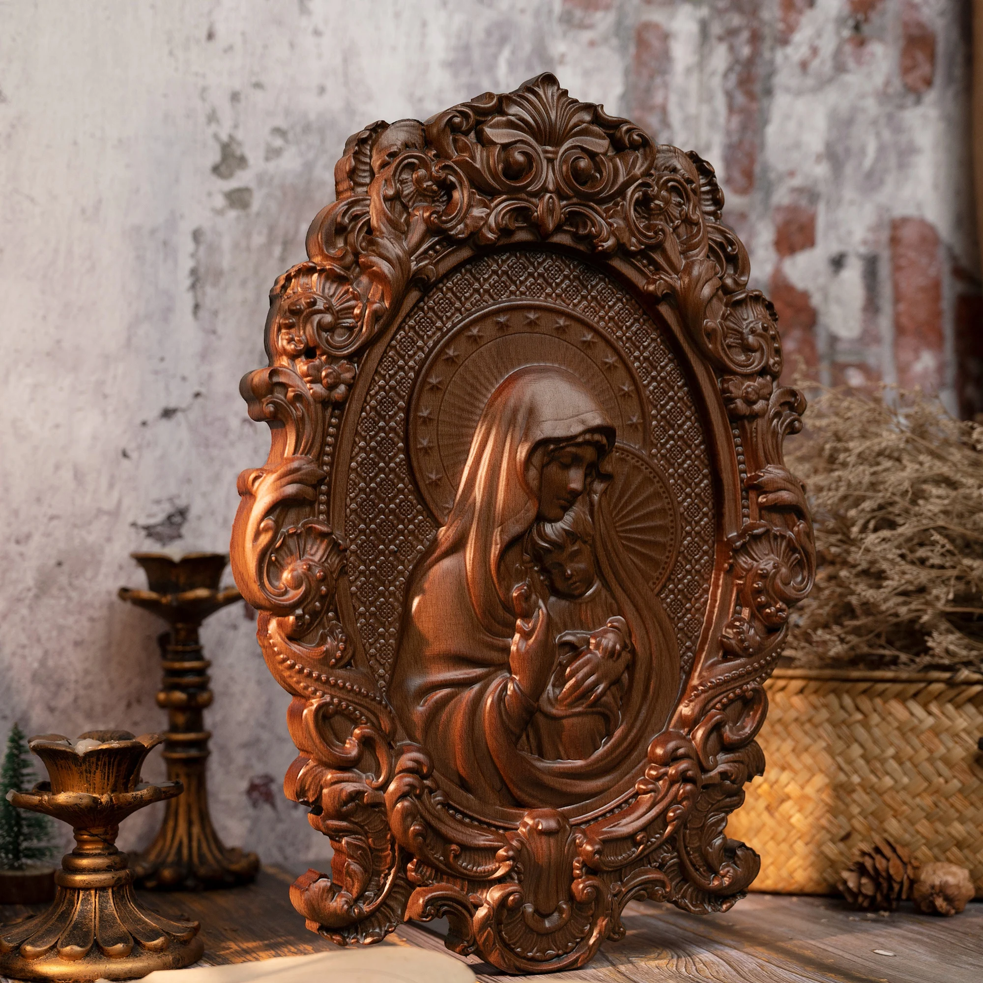 Virgin Mary and Baby Jesus Wood Sculpture Nativity Catholic Religious Image Orthodox Saints Home Furnishings Decor Wall Art