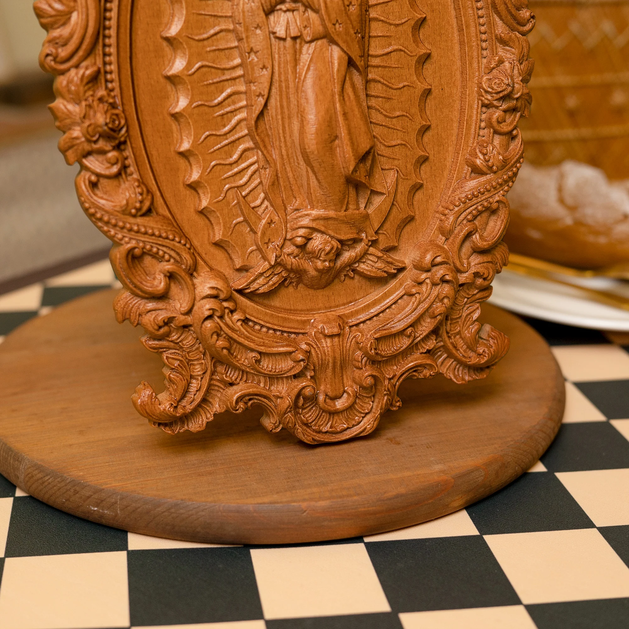 The icon is hand carved from high quality natural European beech wood. The finest details and dimensions of the icons are computerized and manually adjusted, and the final details are hand finished with beeswax or eco-friendly water-based paint. The gold parts are hand painted.