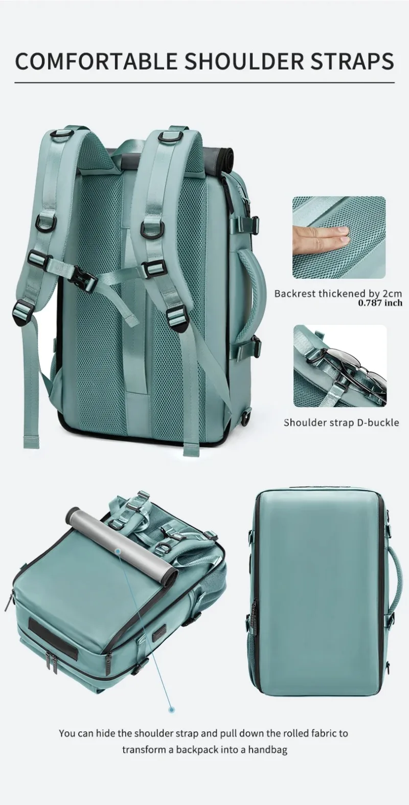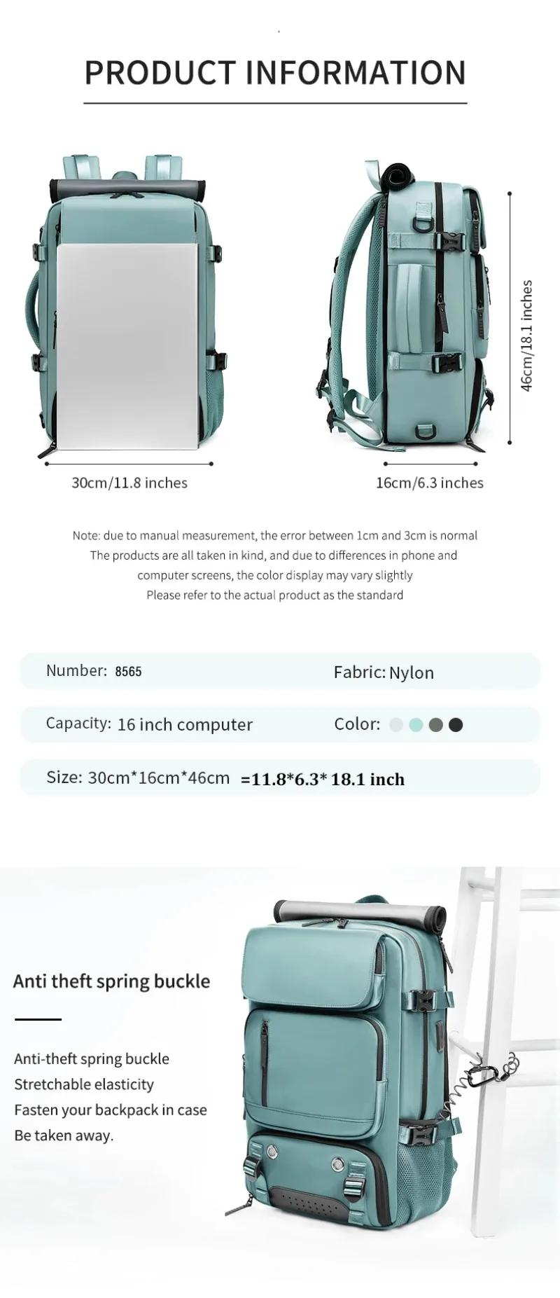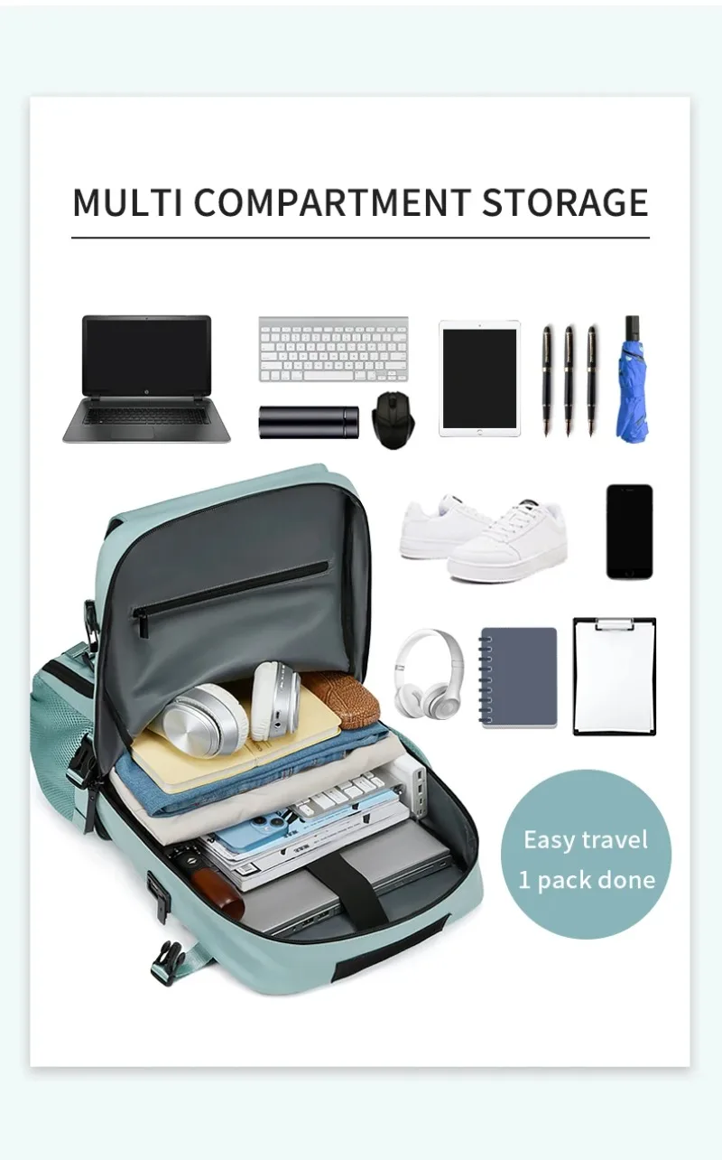 Product Name: Mountaineering Bag/Handbag/Shoulder Bag/backpack Material: nylon Backpack size: 18.1X11.8X6.3 inch (46*30*16CM) Style: outdoor, mountaineering, travel, business Capacity: about 40L Independent shoe bag Multifunctional use design Boarding Environmental friendly Wearable water proof Hidden shoulder strap roll Large capacity design Can install 16-inch laptop High-density waterproof material Hidden USB charging port Breathable honeycomb back cushion Comfortable sponge strap Free anti-theft code lock 9.7 inch IPAD Waist pad zipper bag Can be inserted into the suitcase