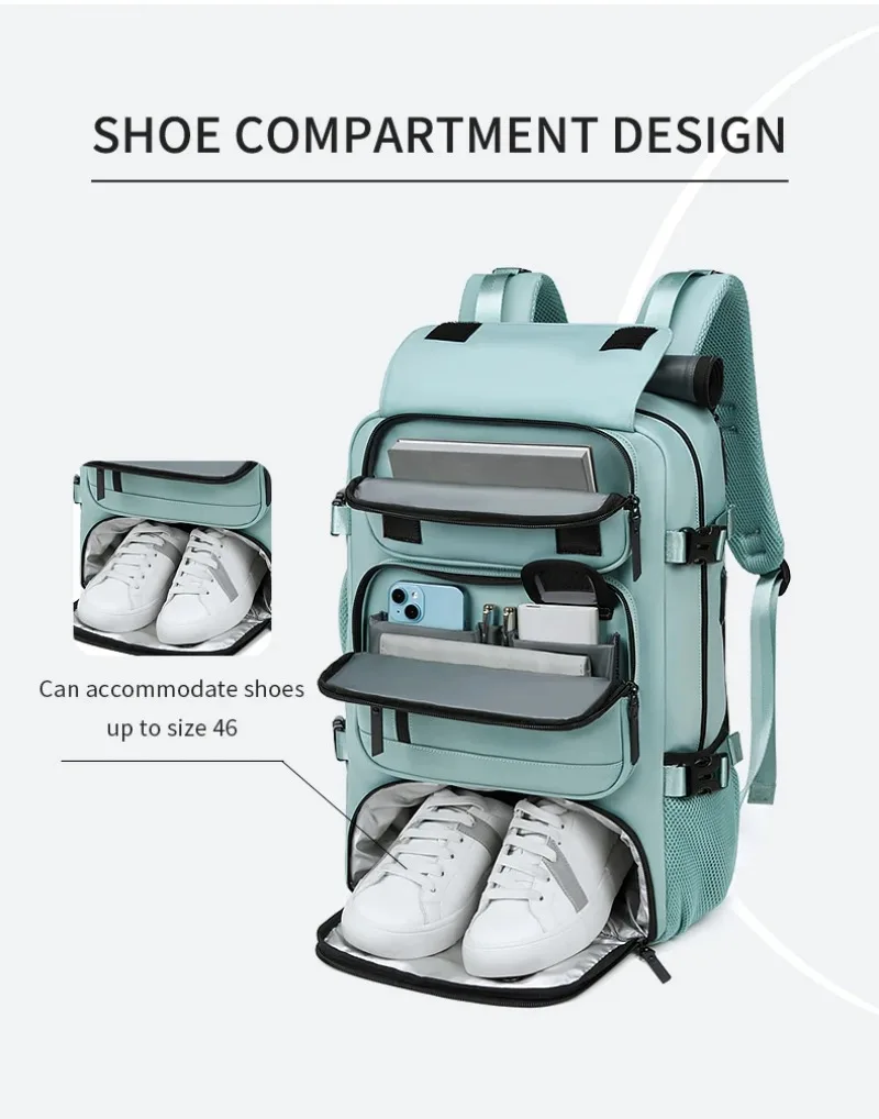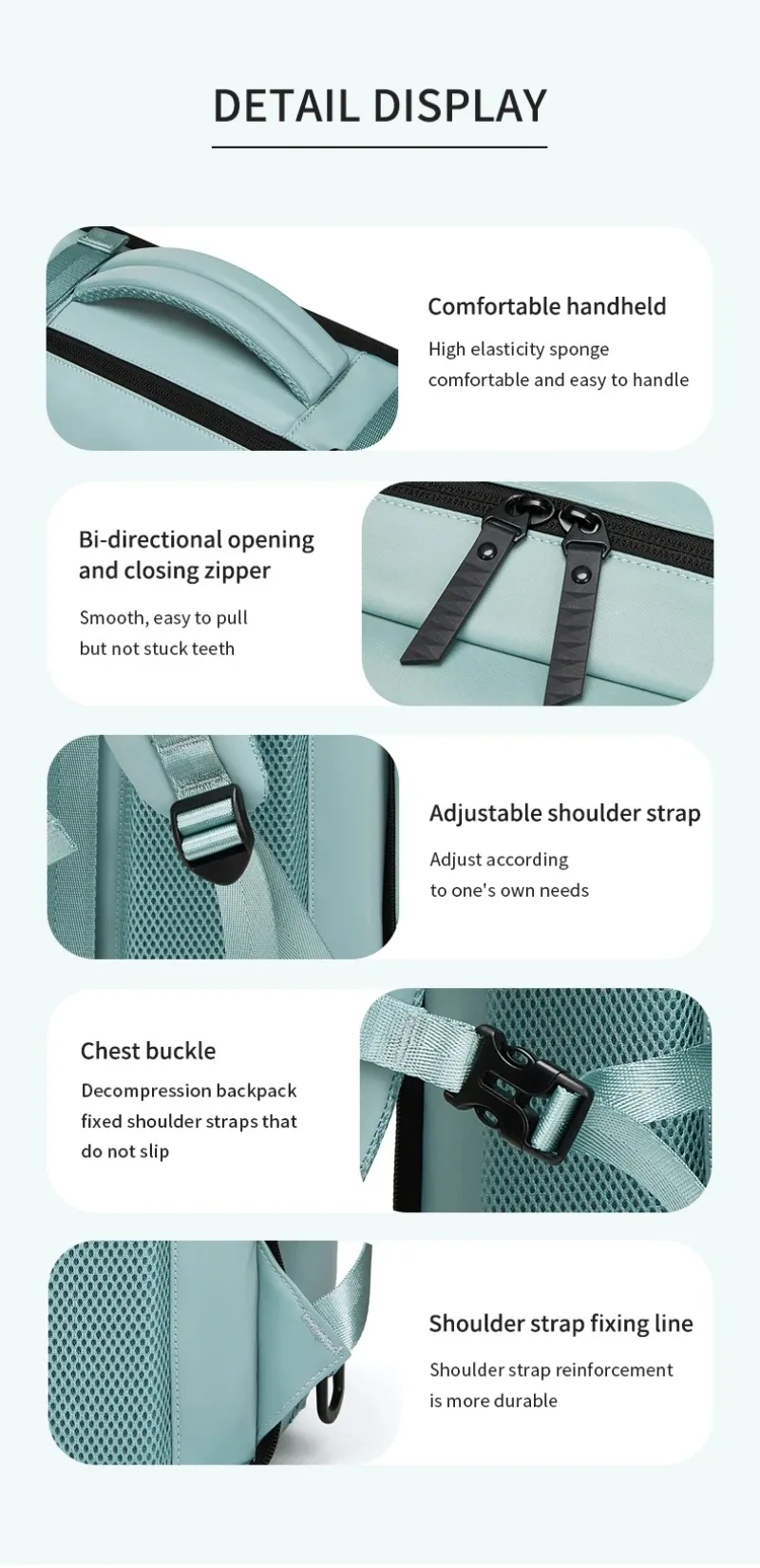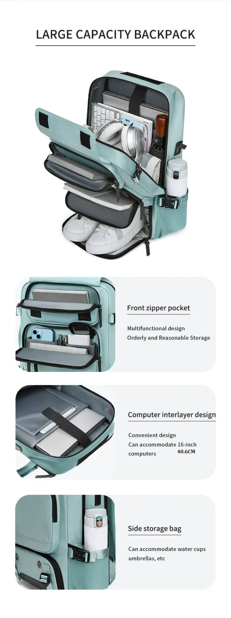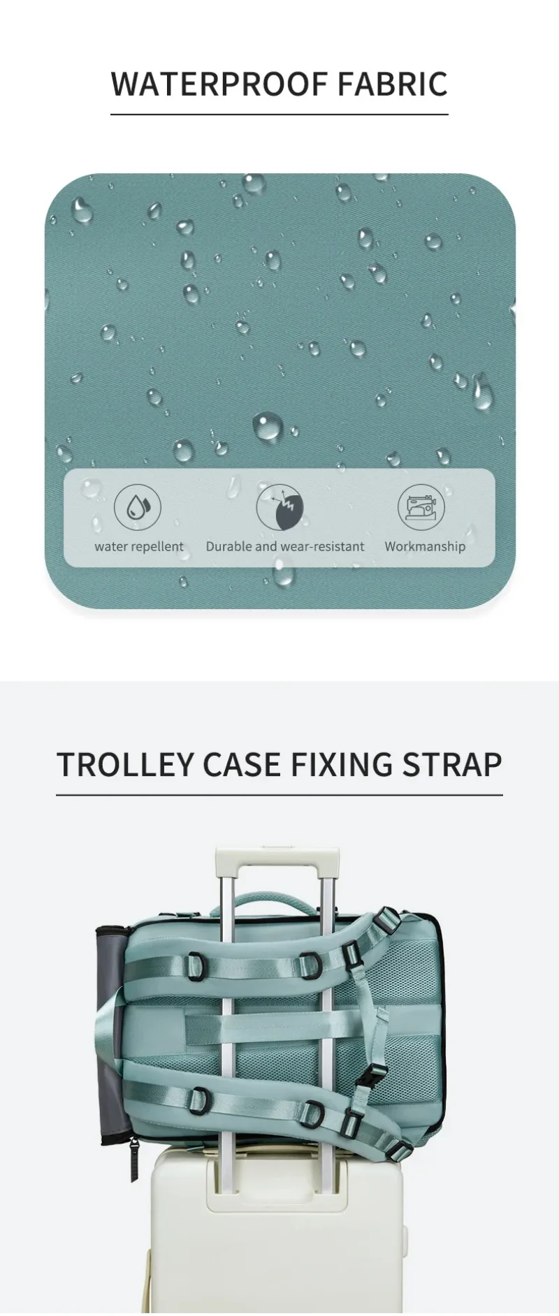 Product Name: Mountaineering Bag/Handbag/Shoulder Bag/backpack Material: nylon Backpack size: 18.1X11.8X6.3 inch (46*30*16CM) Style: outdoor, mountaineering, travel, business Capacity: about 40L Independent shoe bag Multifunctional use design Boarding Environmental friendly Wearable water proof Hidden shoulder strap roll Large capacity design Can install 16-inch laptop High-density waterproof material Hidden USB charging port Breathable honeycomb back cushion Comfortable sponge strap Free anti-theft code lock 9.7 inch IPAD Waist pad zipper bag Can be inserted into the suitcase