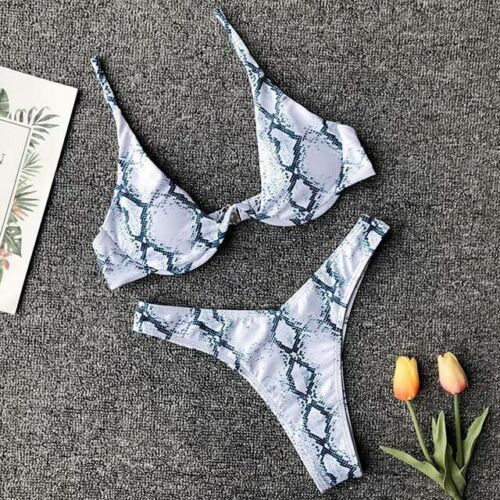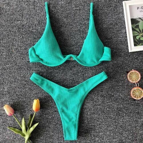 Women Swimsuit V-bar Underwired Ribbed Thong Swimwear Two-pieces Bikini Push Up