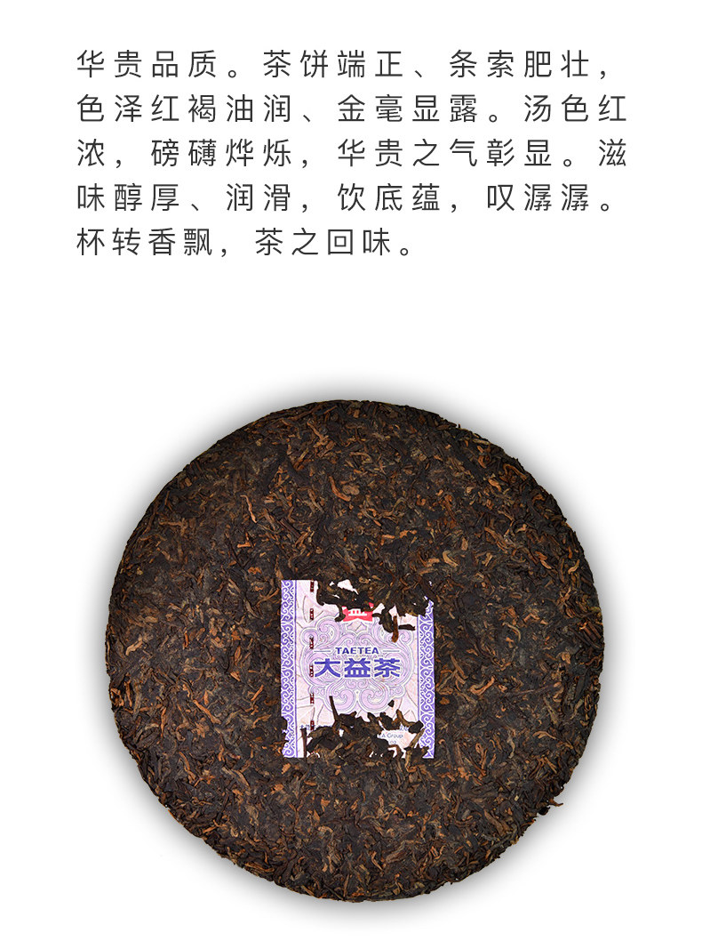Tea Type: Puer Ripe cake tea Net weight: 357g/pc, Price for one pc ONLY. Production Date: 2019 Origin: Menghai,Yunnan,China Manufacturer: Menghai Tea factory,TAETEA Group.